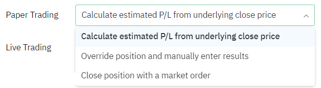Positions expiring in-the-money are subject to assignment and/or broker intervention based on the contract type and your account balance. Use this setting to auto-close ITM positions 10 minutes before expiration OR auto-override and manually enter the position results later. In your Settings, you can select how you want your bots to handle expiring In-The-Money positions 10 minutes before market close on expiration day: