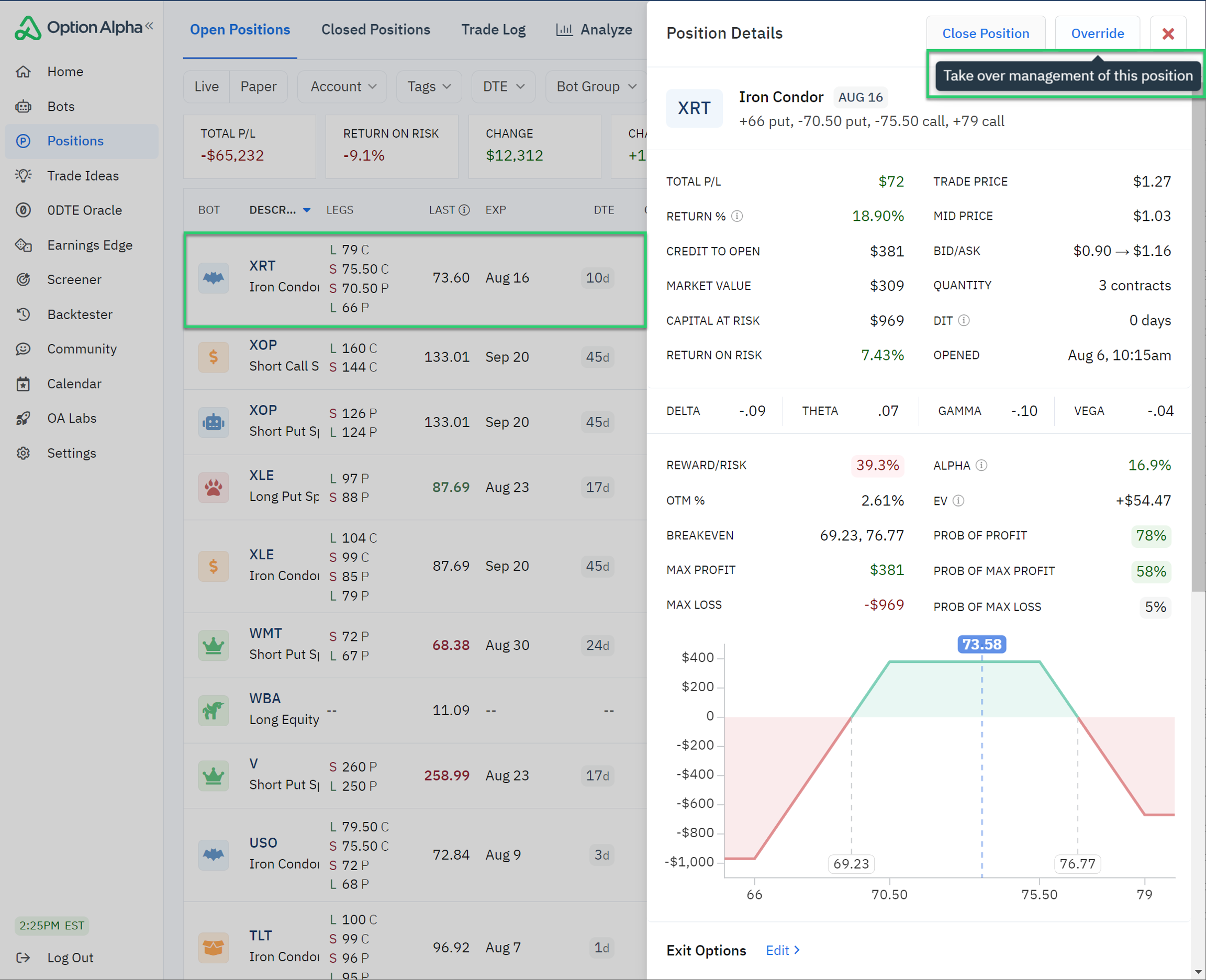 As always, you have the ability to manually override positions, SmartPricing settings, exit criteria, and orders at any time. If you manually override a position, the Option Alpha platform no longer communicates with the position, and the position will not count against position limits or capital allocation limits. You may need to re-consider your bot’s capital allocation limit if you manually override positions.