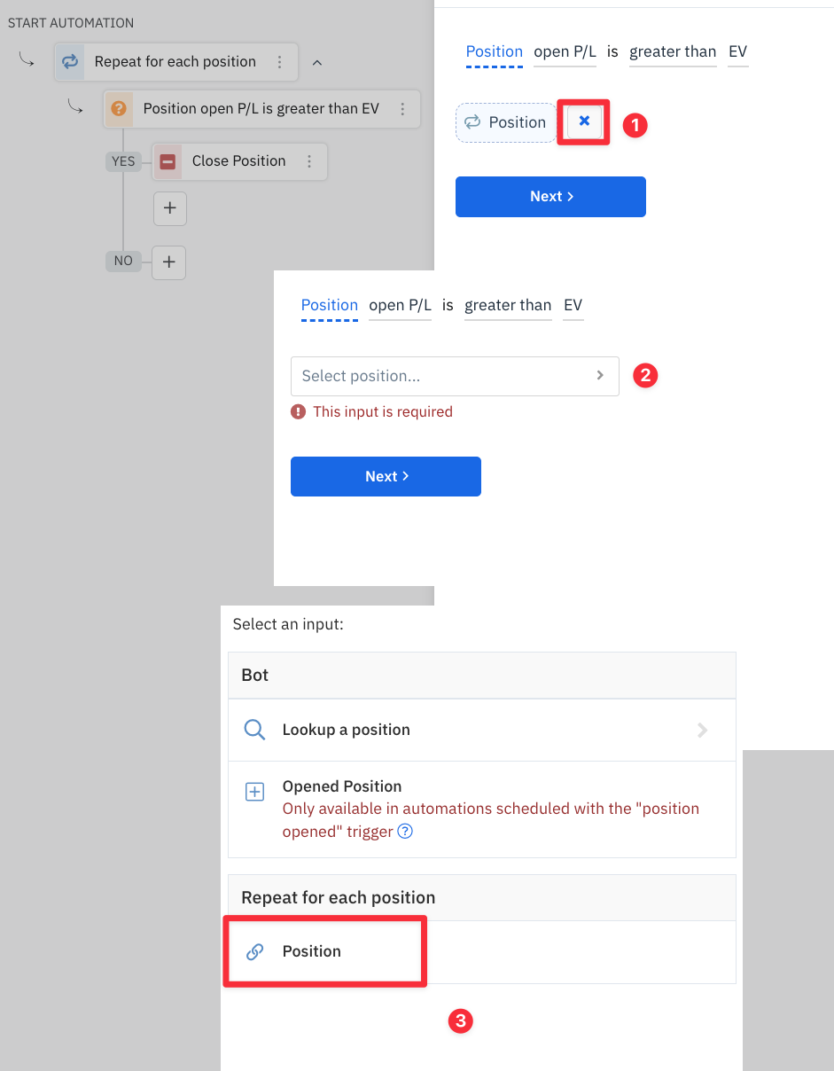 When building automations that utilize a position or symbol loop, it's important to remember to establish your Loop before the other decisions and then link any symbol or position value to the default action that is supplied with the loop.